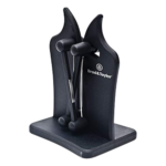 Second of two budget electrics we tested, the LINKYO – 2-Stage Sharpener is about two-thirds the size and cost of the Presto. It also features only two sharpening stages rather than three. Both stages use diamond abrasives, one for coarse sharpening and the other for fine polishing (though to our ears it sounded more a grind than a polish). Like the Presto, the LINKYO includes suction-cup feet to hold it in place and removable plugs to empty out metal shavings.